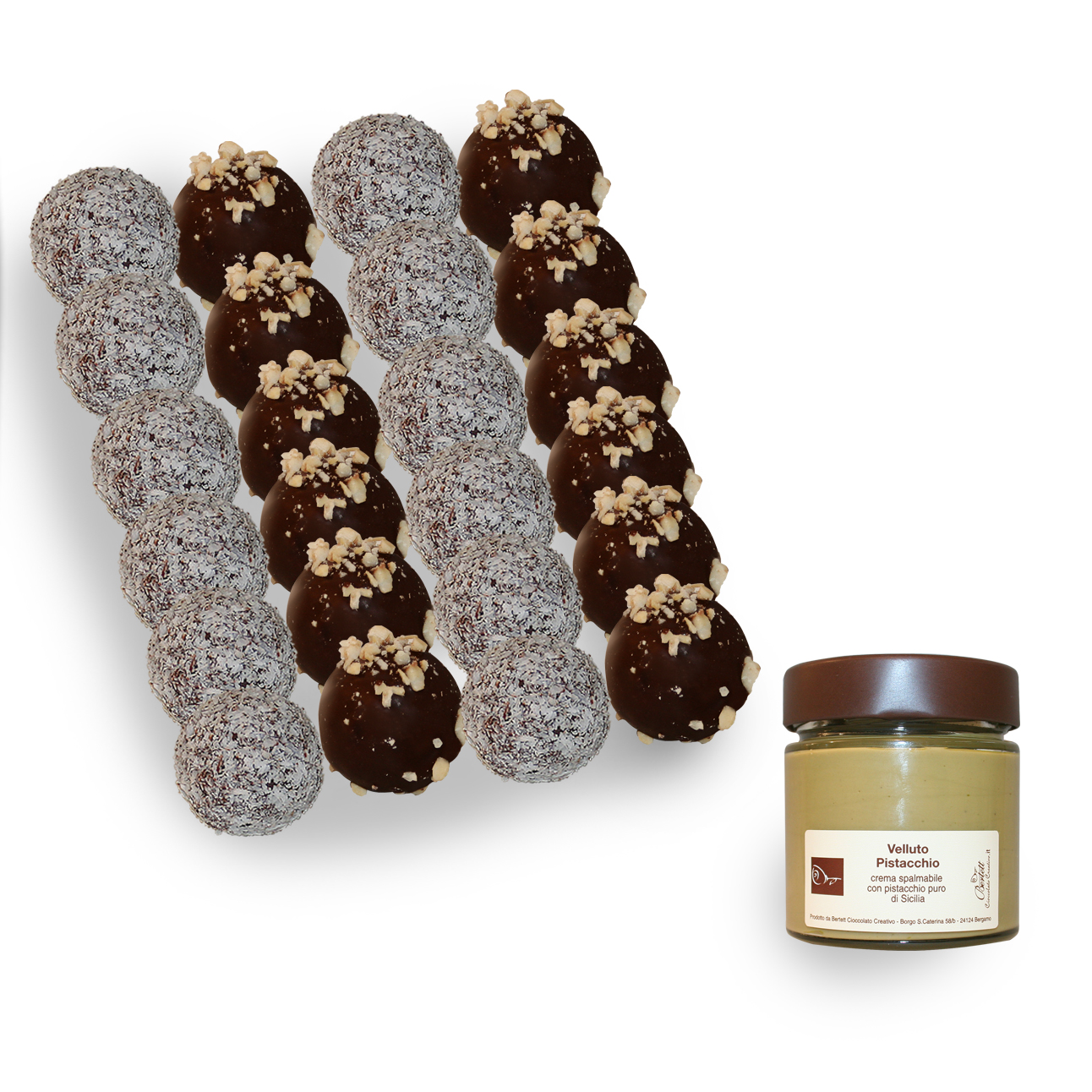 Selezione di 24 truffle alla nocciola IGP del Piemonte e al cocco + Velluto Pistacchio